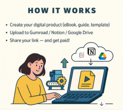 3 Simple StepsCreate your digital product (eBook, guide, template)Upload to Gumroad / Notion / Google DriveShare your link — and get paid!